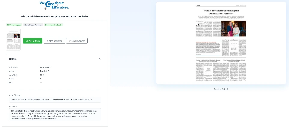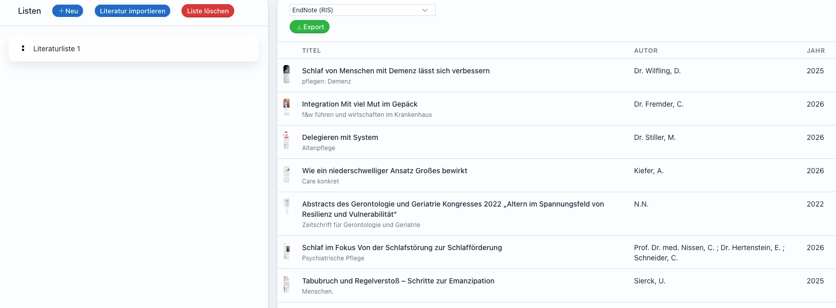 CareLit bietet eine integrierte Literaturverwaltung. Speichern Sie Treffer in Literaturlisten oder Favoriten, exportieren Sie Literatur in verschiedenen Zitationsstilen wie APA, Chicago, Vancouver oder Harvard-Style. Exportieren Sie Literaturverzeichnisse publikationsfertig in Ihre Textverarbeitung. Mit der "Reader"-Funktion erstellen Sie komplette Reader im PDF-Format aus Ihrem Literaturverzeichnis.