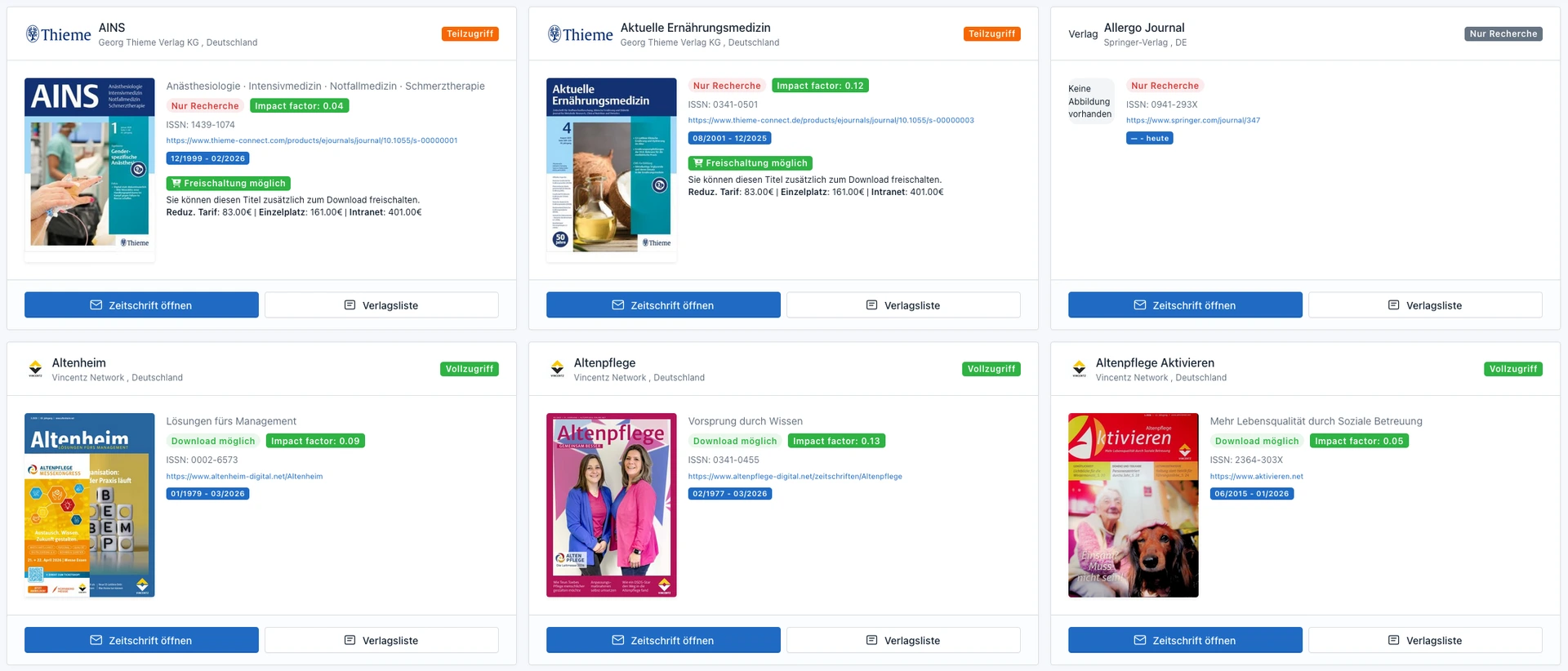 In der Zeitschriftenliste können Sie sich alle Fachzeitschriften anzeigen lassen, die in der Datenbank enthalten sind. Durch den Blick auf einen Titel öffnen Sie das Archiv der entsprechenden Fachzeitschrift. Hier finden Sie die aktuell erschienenen Zeitschriften aus Pflege- und Gesundheitsberufen. Durch einen Klick auf eine Zeitschrift öffnen Sie das Archiv. In dieser Ansicht können Sie sich die wichtigsten Schwerpunkte der Gesundheitsberufe sowie die jeweils relevanten Fachzeitschriften anzeigen lassen. Durch einen Klick auf eine Zeitschrift öffnen Sie das Archiv.